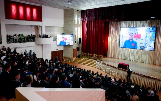 图说:4月20日,吉尔吉斯斯坦首都比什凯克国立大学礼堂举行天宫对话——神舟十五号航天员乘组与上海合作组织国家青少年问答活动。(新华社发)
