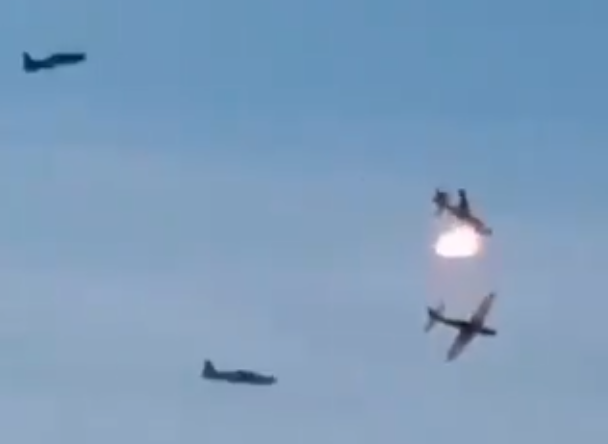 网上发布的视频显示,低空飞行集群中的两架飞机相撞、爆炸并坠落。在另一个视频中,消防设备向冒烟的飞机残骸喷水。