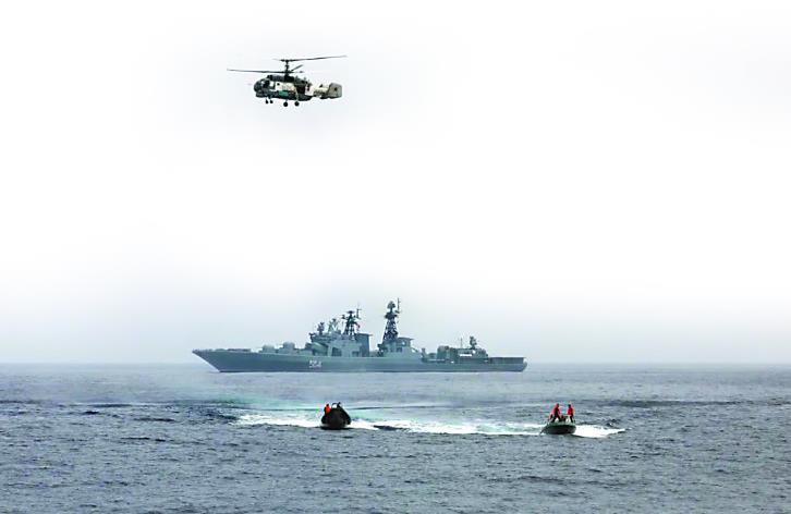 中俄水面舰艇参演兵力抵达联合演习区后组织人员换乘。张海龙 摄