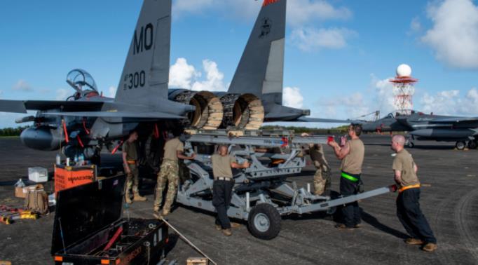 “北方边缘-2”演习期间 一架美军F-15E战机在硫磺岛更换发动机 图源:“突发防务”网站