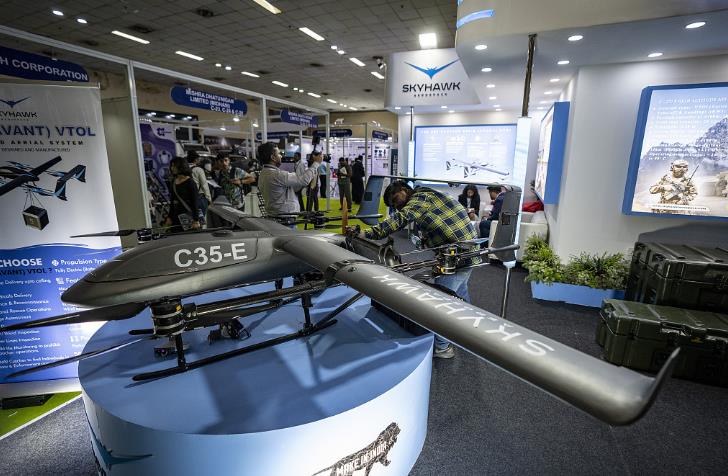 当地时间2023年7月26日,印度新德里,在2023国际军警展览会上,展示了一架由天鹰航空公司制造的无人机。(视觉中国)