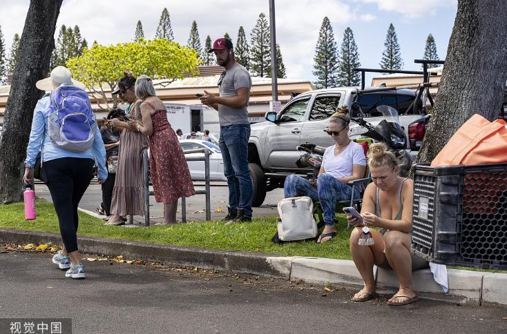 当地时间2023年8月11日,美国夏威夷,居民聚集在Napili市场,通过Starlink与他们的亲人联系。(视觉中国)