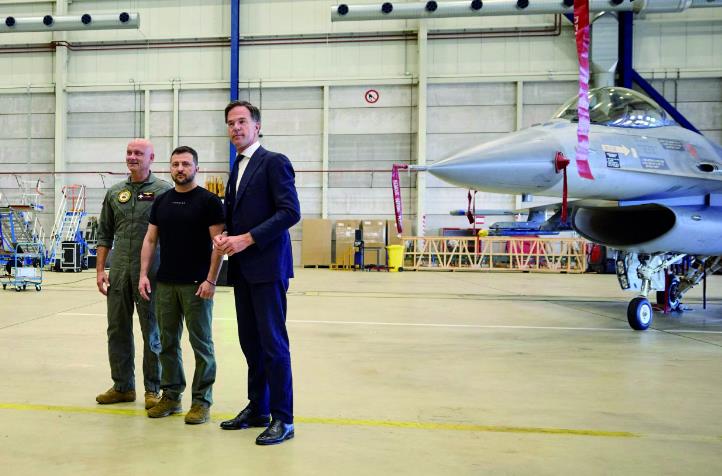 20日,乌克兰总统泽连斯基(中)和荷兰首相吕特(右)在荷兰埃因霍温空军基地内一架F-16战机旁合影。 (视觉中国)