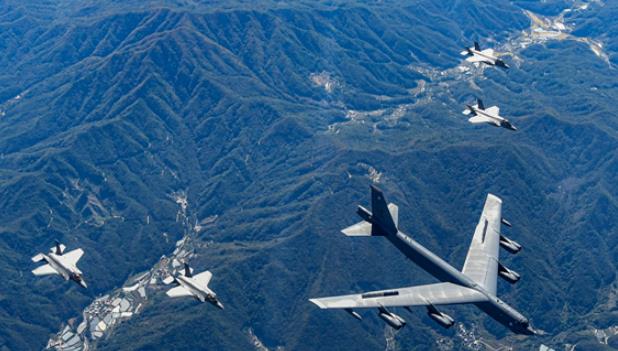 10月17日,韩军F-35A战机与美军B-52轰炸机在朝鲜半岛上空编队飞行 图源:外媒