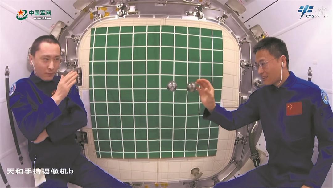中国国家太空实验室内,航天员桂海潮和朱杨柱正在进行动量守恒实验。图片提供:中国载人航天工程办公室