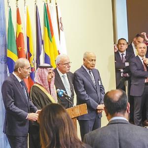 24日,纽约联合国总部,埃及、约旦、巴勒斯坦、沙特等阿拉伯国家外长和阿盟秘书长集体召开记者会,要求加沙立即停火。(视觉中国)
