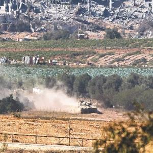 当地时间11月8日,以色列军队持续向加沙城中心推进。图为一辆以军坦克越过以色列南部边界进入加沙地带。(视觉中国)