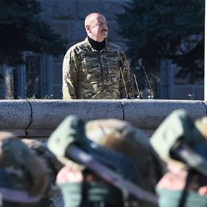 2023年11月8日,纳卡地区斯捷潘纳克特,阿塞拜疆总统伊利哈姆·阿利耶夫出席阅兵式,纪念纳卡冲突3周年。(视觉中国)