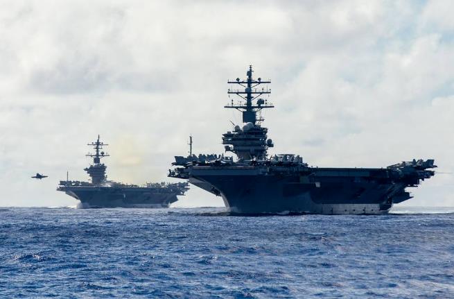 11月6日,美军“罗纳德·里根”号航母与“卡尔·文森”号航母在菲律宾海编队航行 图源:外媒