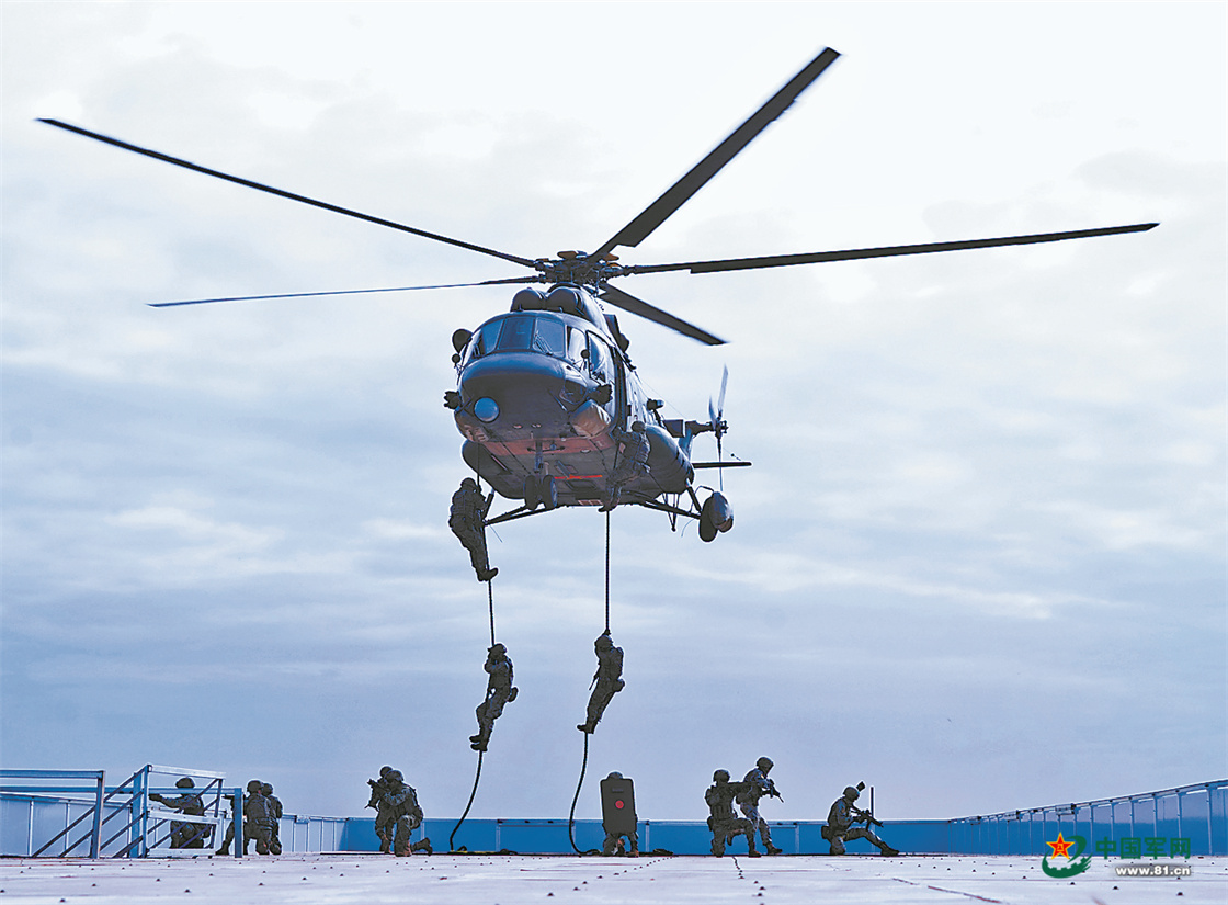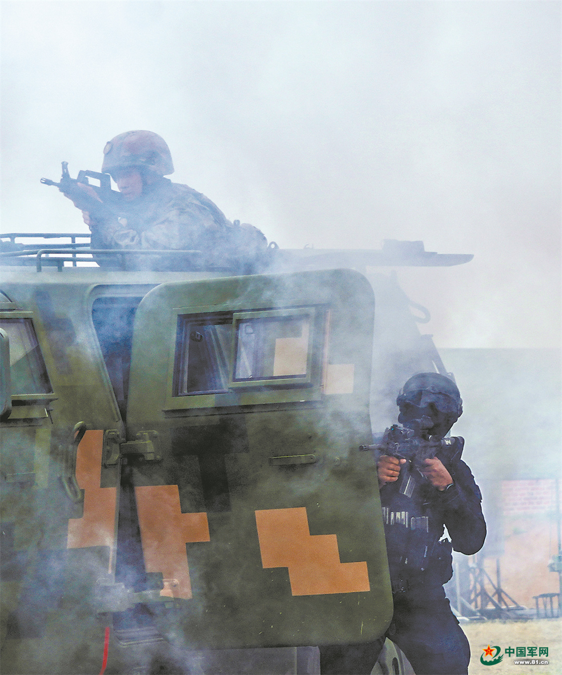 联合实兵演练以异地同步形式在陆上和海上同时展开。全副武装的特战队员从运输直升机快速索降至楼顶,组成战斗队形攻入大楼内部。地面突击队从一楼突入,解救被“恐怖分子”劫持的“人质”。