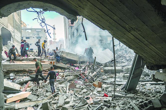 4日,加沙地带南部城市汗尤尼斯遭空袭后,当地民众清理废墟并展开搜救活动。(视觉中国)