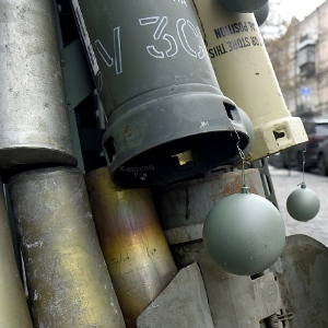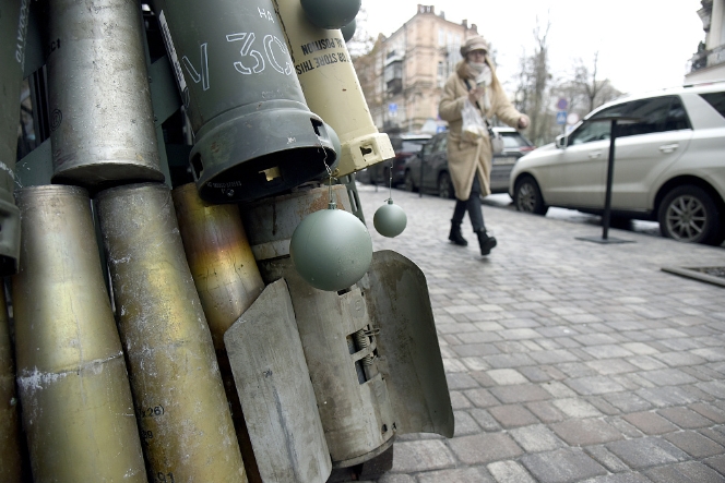 当地时间2023年12月19日,乌克兰基辅街头摆放弹壳制成的“圣诞树”,警示俄乌冲突仍在持续。(视觉中国)