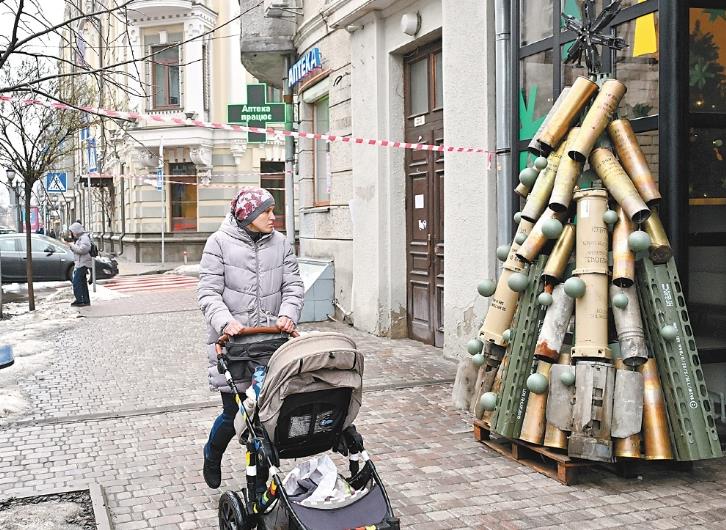 18日,基辅市中心一家咖啡馆外竖立着由用过的弹壳制成的圣诞树。(法新社)