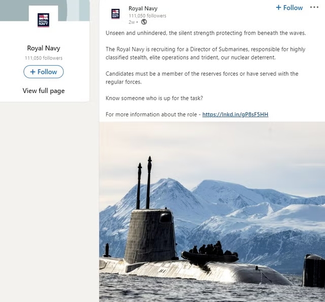 据英国《每日电讯报》6日报道,英国海军正通过领英招聘一名海军少将。这名两星少将年薪15万英镑,将指挥一艘核潜艇,负责“高度机密的精锐行动和核威慑力量‘三叉戟’导弹”。招聘信息显示,求职者必须为英国预备役人员,且担任过潜艇指挥官。