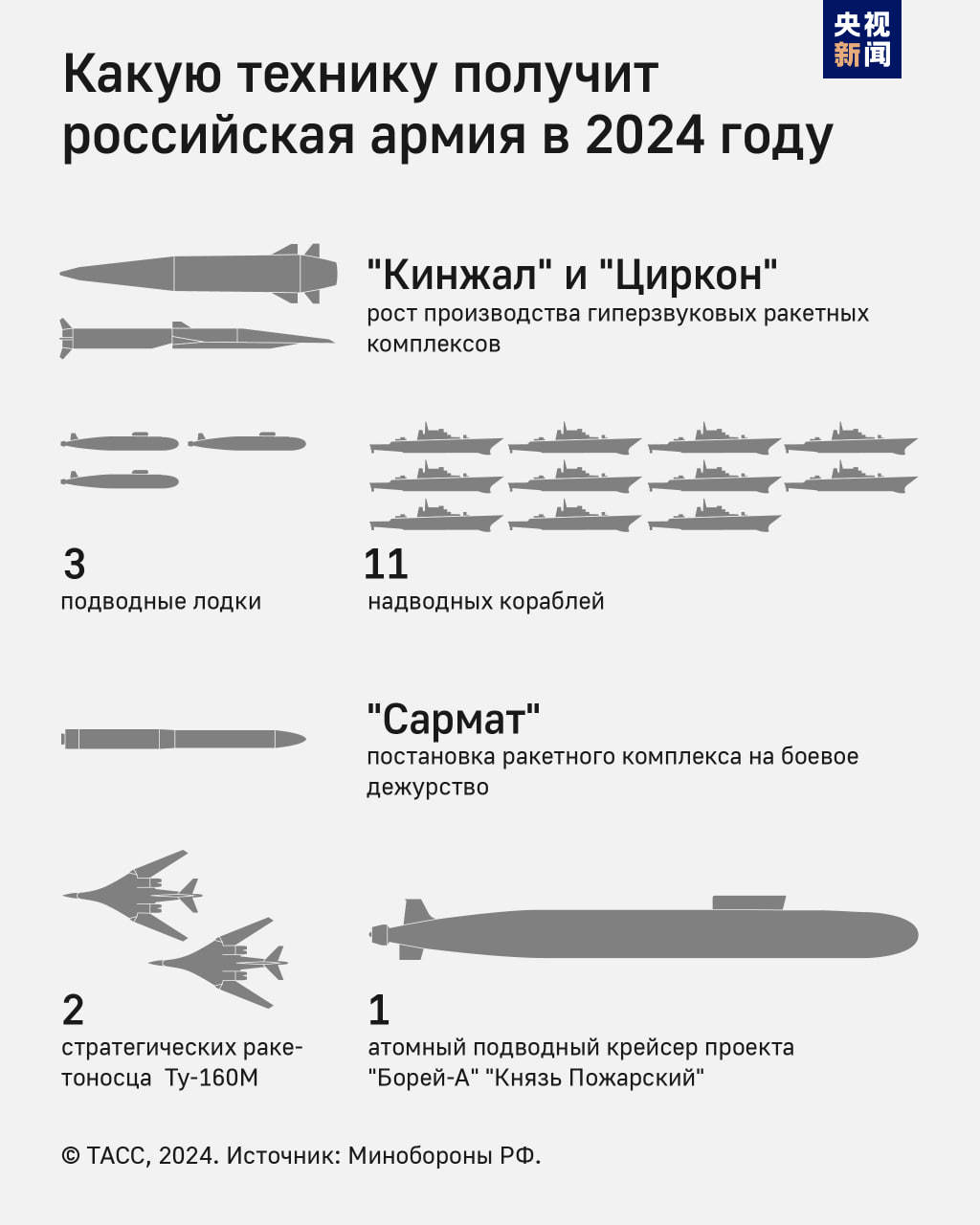 另外,2024年“萨尔马特”洲际导弹将开始战斗值勤,同时俄罗斯将提升高超音速导弹“匕首”和“锆石”的产量并继续开发新式装备。海军将接收3艘潜艇和11艘水面舰艇。(总台记者 王德禄)