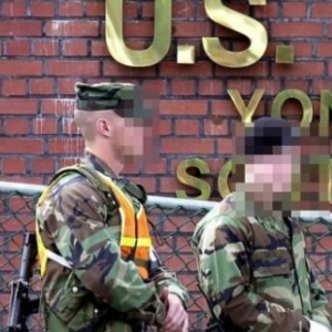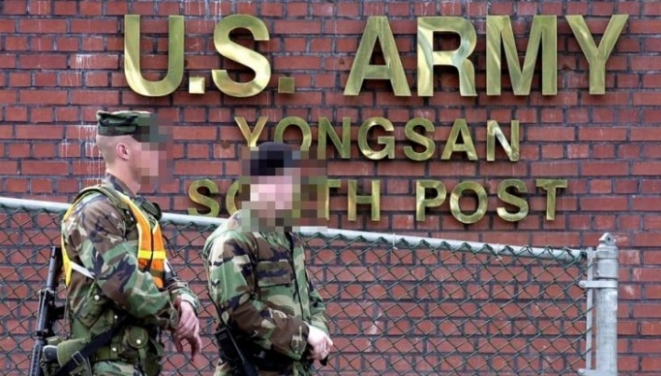 两名驻韩美军士兵在韩国龙山基地外 资料图 图源:韩国《韩国时报》报道配图
