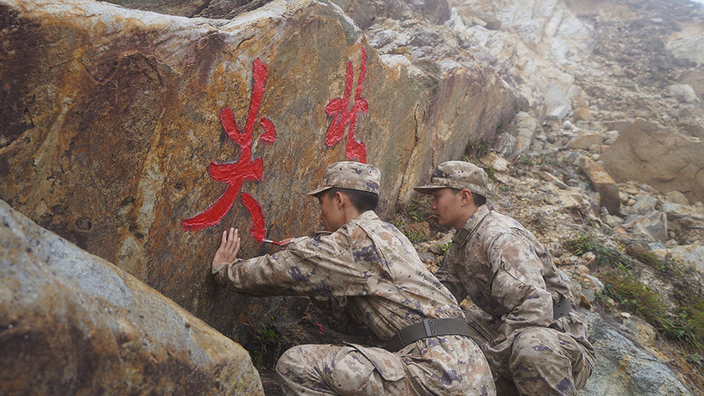 南部战区陆军某旅“海防模范连”的官兵给北尖岛巡逻路上的石刻描红(2月2日摄)。新华社记者 刘一诺 摄