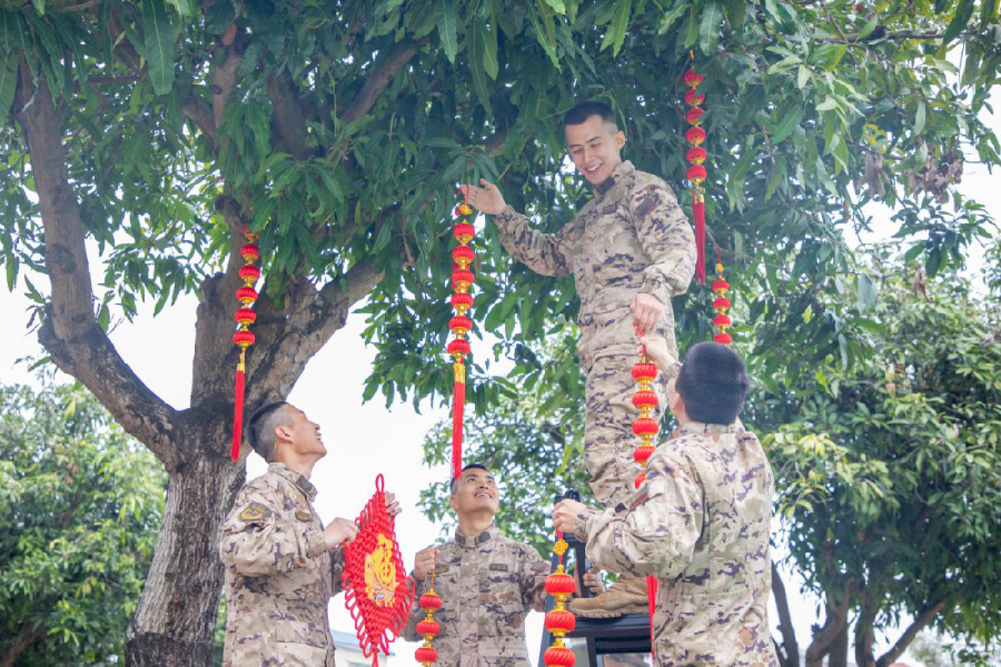 春节前夕,武警广西总队北海支队营区内年味十足,官兵们脸上洋溢着喜庆的笑容,张灯结彩迎新春。