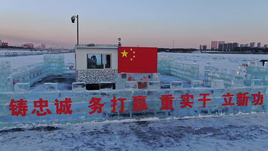 2月9日,陆军某边防旅官兵在中俄界江冰哨站岗执勤。新华社发(许春林 摄)