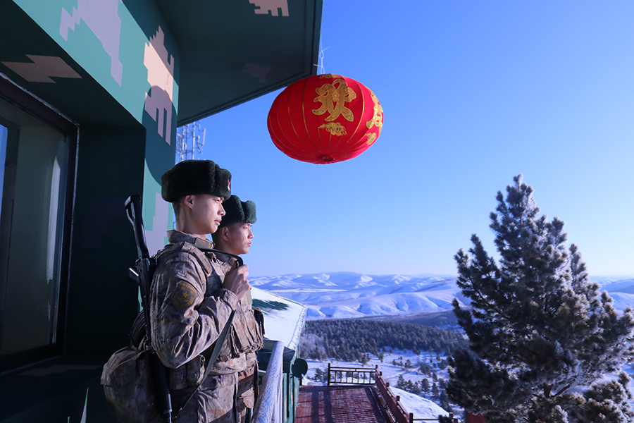 2月9日,陆军某旅三角山边防连官兵在哨所站岗执勤。新华社发(张少为 摄)