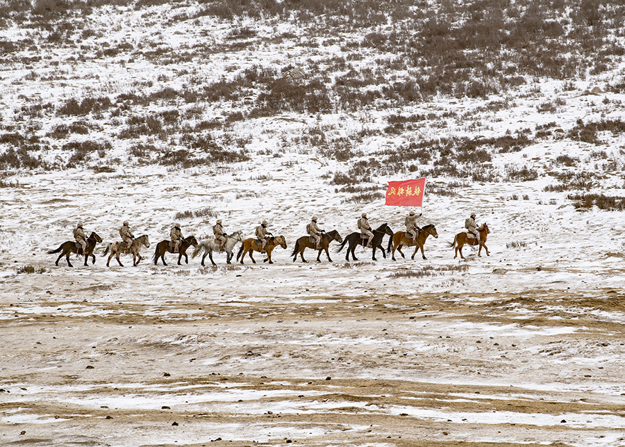 2月9日,火箭军某部骑兵连在海拔近4000米的雪域高原巡逻。新华社发(刘明松 摄)