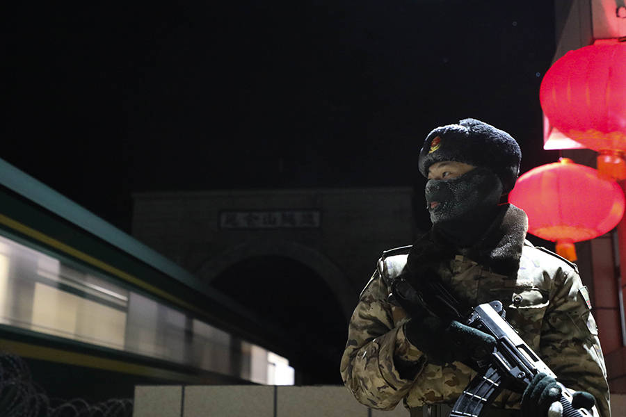2月9日,武警甘肃总队武威支队官兵在乌鞘岭隧道站岗执勤。新华社发(侯崇慧 摄)
