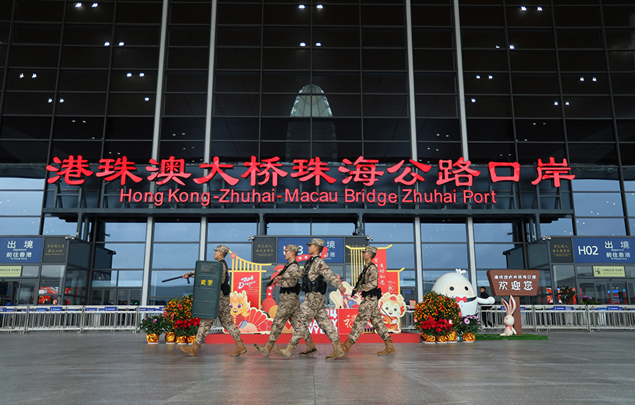2月9日,武警广东总队珠海支队官兵在港珠澳大桥珠海公路口岸执勤巡逻。新华社发(郑声凯 摄)