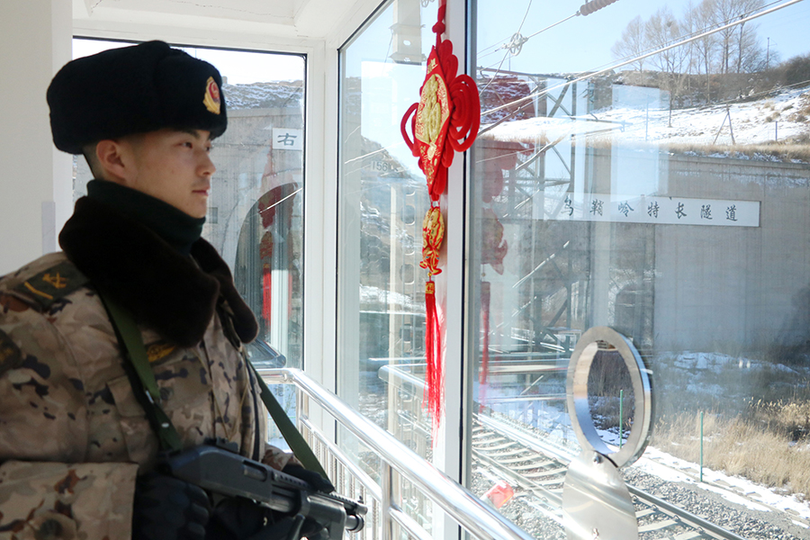 2月9日,武警青海总队海西支队官兵在海拔4000多米的青藏铁路昆仑山隧道站岗执勤。新华社发(杨浩 摄)