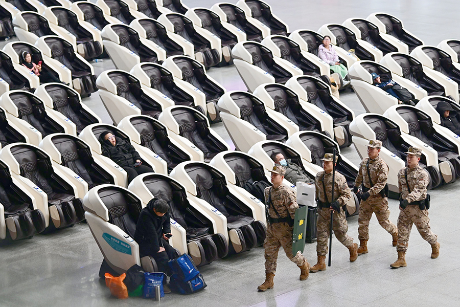 2月9日,武警江西总队南昌支队官兵在南昌火车站候车大厅执勤巡逻。新华社发(曹先训 摄)