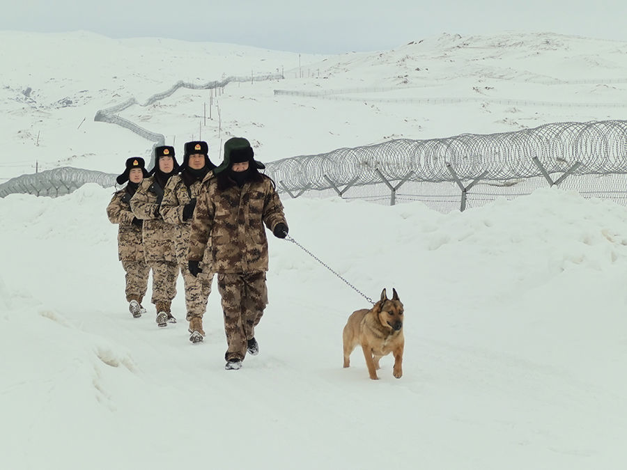 2月9日,武警兵团总队某支队官兵与护边员沿中哈边境线踏雪巡逻。新华社发(黄超 摄)