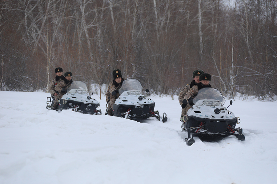 2月9日,新疆军区阿黑吐拜克边防连官兵驾驶雪地摩托在边防点位巡逻。新华社发(段伟 摄)