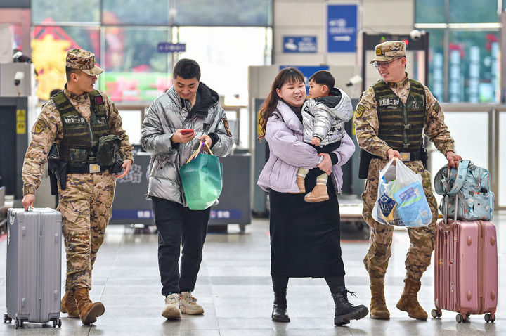 2月9日,武警重庆总队官兵在重庆北站为过往的旅客提供帮助。新华社发(王肸 摄)