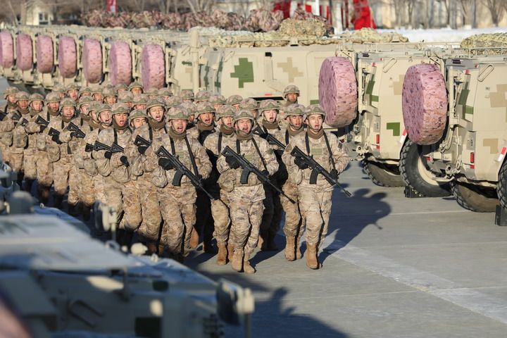 2月9日,新疆军区某红军团组织拉动演练,官兵们奔赴战位。新华社发(张诗宏 摄)