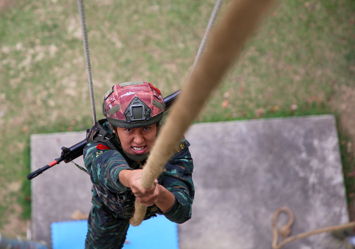 2月9日,武警海南总队儋州支队特战中队组织课目训练,特战队员正在攀爬长绳。新华社发(王翔宇 摄)