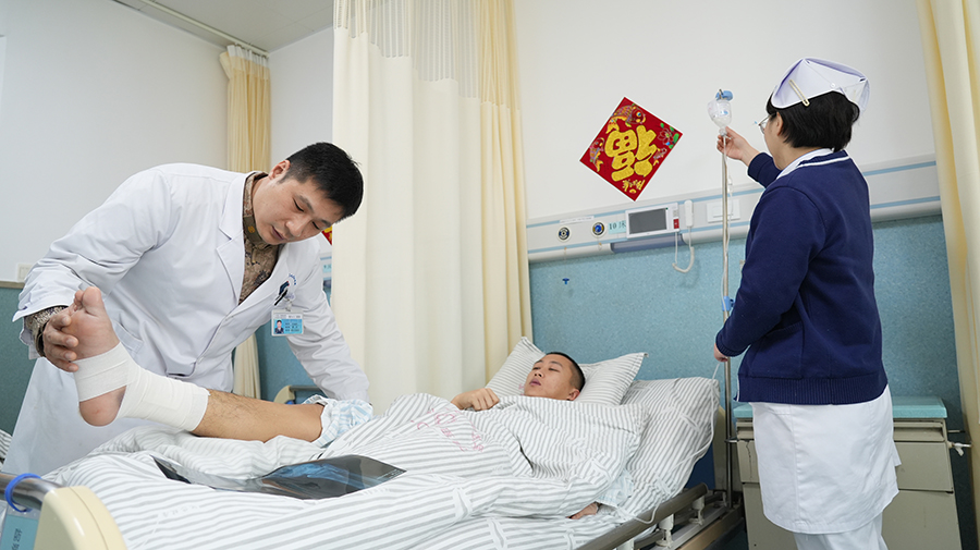 2月9日,联勤保障部队第902医院值班医生在军人病房查看患者术后康复情况。新华社发(年乐怡 摄)