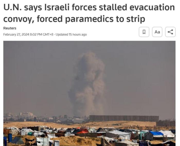 据联合国网站消息,联合国人道主义事务协调厅发言人拉尔克在日内瓦发表讲话时表示,疏散前已向以色列当局通报了计划,以色列当局承认收到了通知,但以军没有提供“任何沟通”,说明为何救护车仍被扣留至少七个小时,也没有说明为何护理人员“被带走,并被迫脱掉衣服”,其中两人仍未获释。