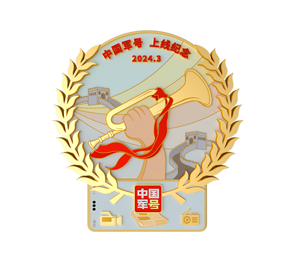 中国军号上线纪念徽章以军号、长城、麦穗、红飘带、媒体沿革载体等元素进行创意组合。主体元素以井冈山“胜利的号角”雕塑为蓝本,象征着人民军队一往无前的胜利征程和磅礴力量。背景元素采用雄伟的万里长城,象征着人民军队保家卫国的强大力量、人民子弟兵以血肉之躯筑就的钢铁长城。徽章两侧以金黄色的麦穗点缀,象征着丰收、富足和安定。