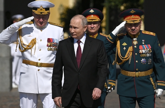 2023年7月30日,俄罗斯圣彼得堡,俄罗斯总统普京(中)、俄罗斯海军总司令叶夫梅诺夫(左)和俄罗斯国防部长绍伊古(右)。(视觉中国)
