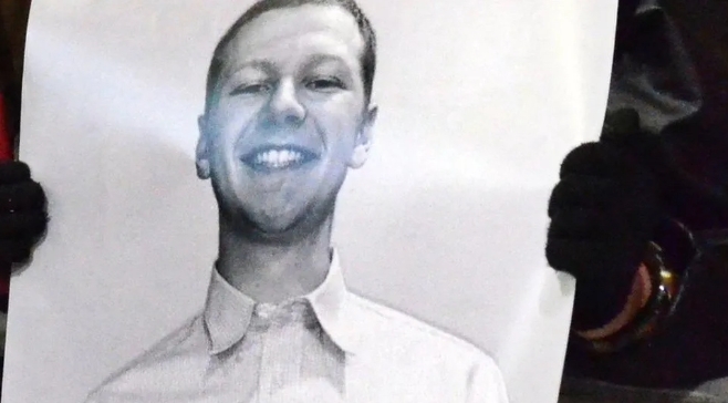 美国芝加哥,一名抗议者举着阿伦·布什内尔的照片。图源:英媒