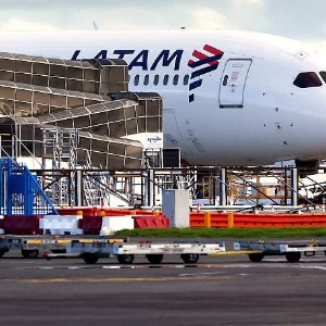 3月12日,新西兰奥克兰国际机场的停机坪上,一架拉丁美洲航空的波音787。一天前,一架从澳大利亚悉尼飞往奥克兰的波音787-9“梦想”客机空中发生急降,出现剧烈颠簸,导致数十名惊恐的乘客受伤。(视觉中国)