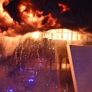当地时间2024年3月22日,俄罗斯莫斯科近郊,克罗库斯城音乐厅遭遇恐怖袭击,音乐厅燃起大火。(视觉中国)