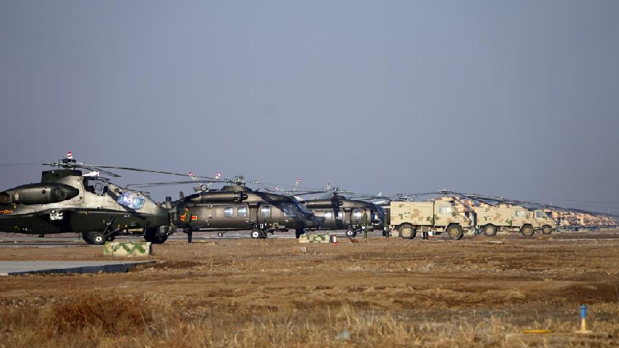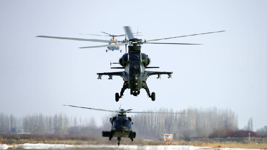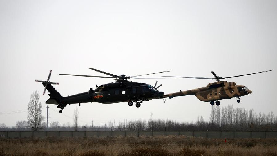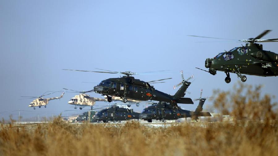 近日,在天山北麓某机场,新疆军区某陆航旅数十架直升机振翅升空,展开实战化飞行训练。