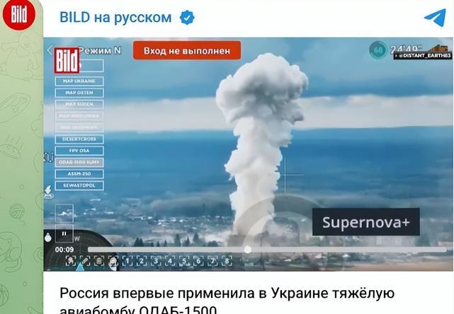 据乌克兰新声音网站报道,德国《图片报》俄语版3月30日在社交平台Telegram上发帖称,在俄乌冲突战场上,俄罗斯军队近日被观察到“首次”使用了威力可观的ODAB-1500炸弹。