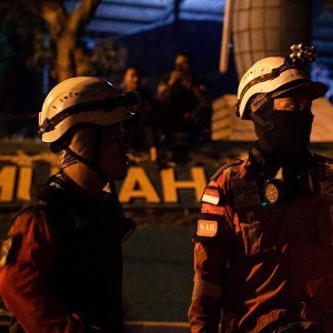 当地时间2024年3月31日,印尼西爪哇省茂物发生多起爆炸,消防队员站在军用弹药库入口处。(视觉中国)