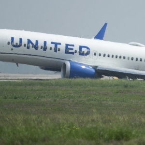 2024年3月8日,美国休斯顿乔治布什洲际机场,一架联合航空公司的喷气式飞机停在草地上。(资料图:视觉中国)