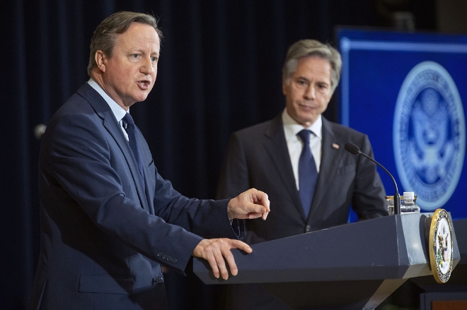 2024年4月9日,美国华盛顿特区,英国外交大臣戴维·卡梅伦与美国国务卿布林肯在国务院会晤时发表讲话。(视觉中国)
