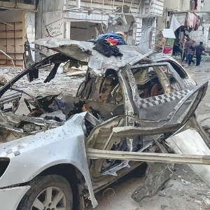 图为哈尼亚儿子10日所乘车辆遇袭后的残骸。