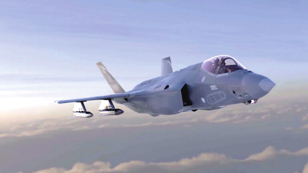 洛马公司在2024年度海空天大会上展示的F-35A外挂“灰鲭鲨”导弹概念图。可见F-35A战斗机右翼下挂装2枚,整机可外挂4枚,洛马公司称还可内埋2枚;按此模式,F/A-18E/F战斗机也应能挂装4枚。