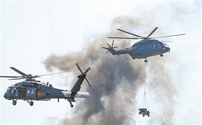 空地协同,凌厉出击。指挥所根据战场侦察情报,适时调整作战方案。武装直升机进行超低空隐蔽突防,对目标实施精确打击;运输直升机吊挂全地形车进行空中投送,第二批次突击队员驾乘车辆向“敌”纵深发起冲击……