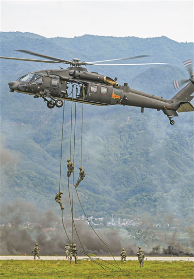 悬停,开舱,离机……战机抵达目标地域上空,突击队员迅速绳降着陆。随后,队员们兵分两路,一路佯攻“敌”前沿阵地,吸引火力;另一路则利用复杂地形迂回“敌”后,伺机展开进攻。